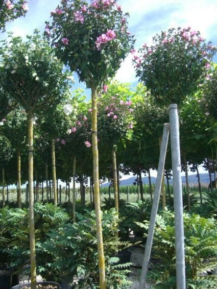 Hibiscus syriacus ‘Oiseau Blue’ (Altheastruik) is een zeer bekende struik, maar hier is de Hibiscus gekweekt als boom.