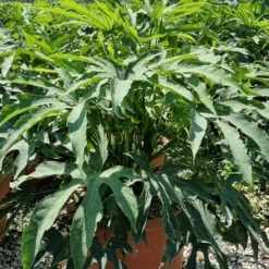 De dikke bladeren zijn witbont van kleur, wat deze Pittosporum een opvallende exotische plant maakt op uw terras.